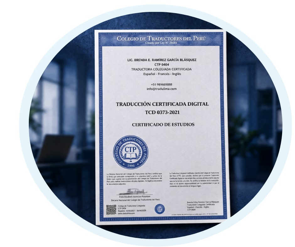 La Traducción Certificada Digital se envía en formato PDF y puedes imprimirla todas las veces que lo requieras. La versión impresa conserva su validez legal. Si prefieres la versión física clásica, deberás recogerla en Miraflores, previa cita.